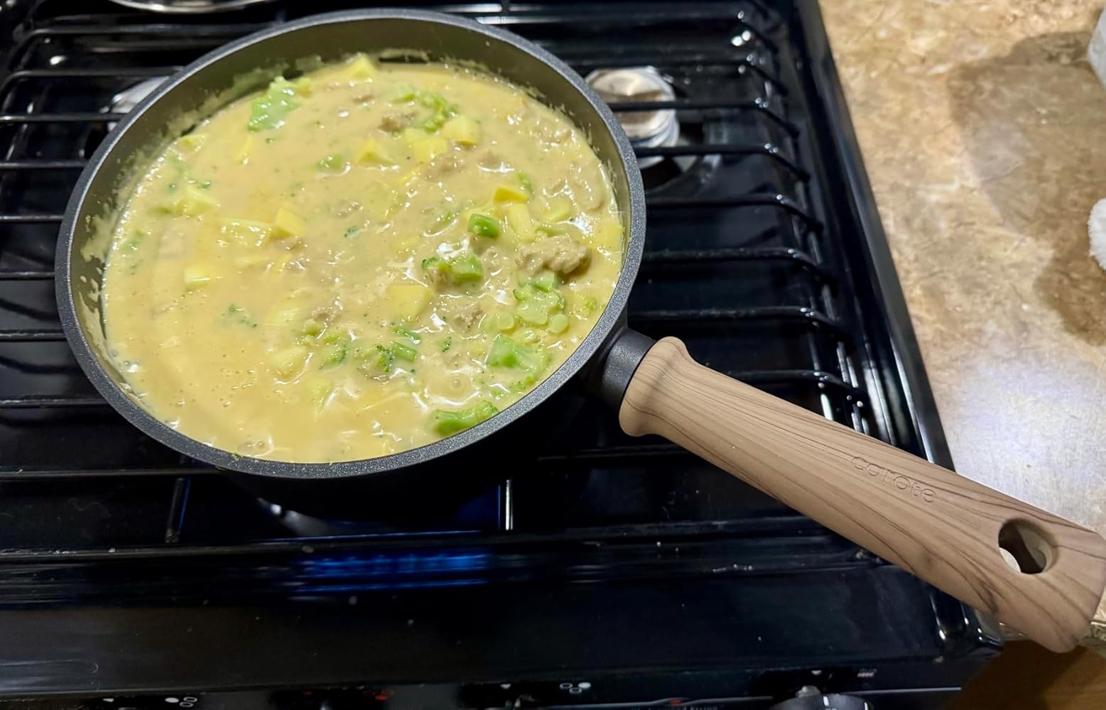 I wanted some pots and pans with wood handles but I couldn’t find a set reasonably priced. I came across this set and wasn’t sure how I would feel about the silicone handles, but after purchasing them and using them for a bit now, I do really love this set. Overall, it feels like a quality set of pots and pans, the handles feel nice and look great, although slightly off of the wood look. The non stick works great, I’ve had no issues with cleaning the pans. I would 100% recommend this set. What you see in the pictures is what you get.
