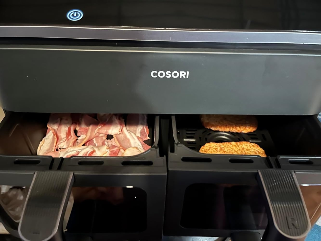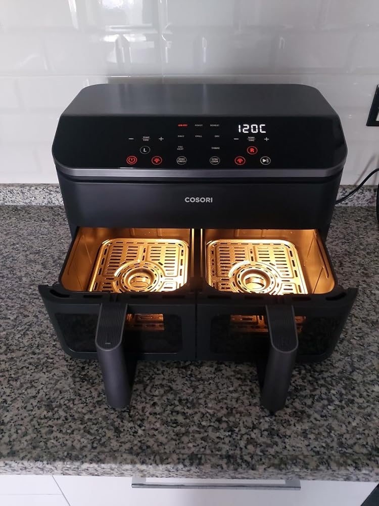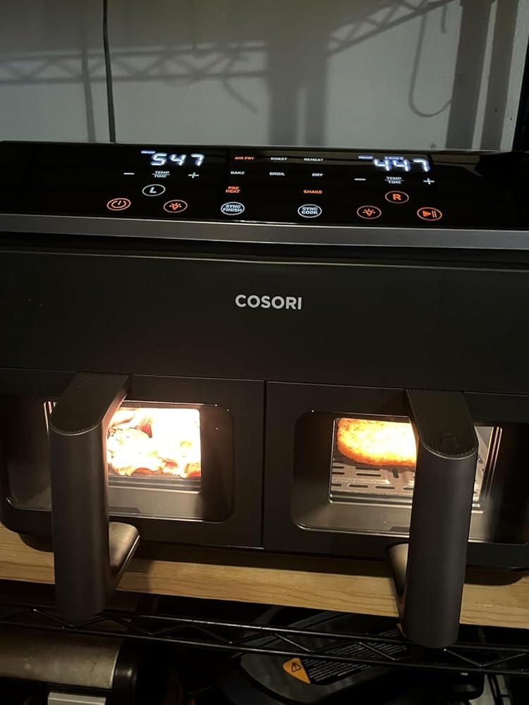 This is one of the greatest gadgets in my kitchen! I’m already a fan of cosori products. My first cosori air fyer I got in 2020 it was recalled in 2023 but it was hard to let go. I finally cut the cord and registered for my replacement (that I will be giving to my mother). In the meantime I bought this good buddy and I do not regret!! Being able to shorten my meal cooking times by being able to cook two things at once on their own times is amazing!! If you’re thinking about it, BUY IT!! It has a great esthetic too and I love how you can turn on and off the cooking lights! Easy to use, noise level is minutia, easy to clean!