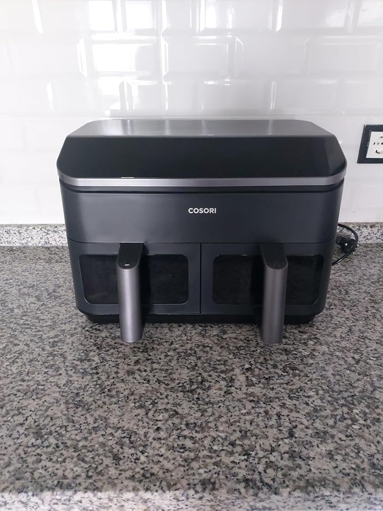 I loved this air fryer so much I used it several times a week to cook everything I could in it. I could cook full meals in it until it started grinding and squeaking so badly I couldn’t leave it on. I guess it was the fans making the noise?I reached out to Cosori to see if there was something I could do to fix the noises and they not only responded immediately, they also sent me a new Air Fryer. After I gave them order information, model number and a video of the noise, a new air fryer was on the way to me. Pretty impressive customer service. I received my new Air Fryer within days, boxed up the squeaky one and returned it to Cosori with a pre-paid label and that was it. The new air fryer works perfectly and I hope to use it for many, many years. Thank you Cosori for your excellent and honorable Customer Service! That’s rare these days.I wanted an air fryer because I wanted to be able to have a steak again. Three years ago I moved into an old condo that has a stove exhaust fan that doesn’t exhaust anything and I found that out the first time I broiled a steak.For some reason, owning an air fryer was never on my radar until I saw a YouTuber using one to air fry a steak. Eureka! I can have steak again! I fixed my first steak last week since my first disaster three years ago and it was delicious. I broiled a steak in the Right drawer and a baked potato in the left drawer and they were both delicious. Cooked to perfection! I broiled the steak for 7 minutes on each side and was perfectly medium. The baked potato was baked at 400⁰ for 40 minutes and flipped half way through. It too was perfectly baked.So far I have cooked frozen shrimp, frozen fried chicken, tater tots, pizza rolls, hamburgers and my favorite thing… Roasted potatoes with chopped garlic and parmesan cheese – heaven on a plate.I have also reheated biscuits and pizza and that function is a dream compared to the microwave that turns any kind of bread into something rock hard.I like to be able to sink cooking two things at the same time and sync two things to finish at the same time.It’s hard to believe it took me years to even consider buying an air fryer! And now absolutely love it and can enjoy an occasional steak again.The Cosori comes with a recipe book and an instruction book to show you how to use it. In the back of the book there’s “notes” pages I use to write down everything I have air fried, at what temperature and for how long. And any other instructions for a particular recipe. That’s a handy thing to have. I also really like the interior kight in each compartment so you can see the cooking process.The Corsori is also extremely easy to clean! While I eat, the two compartments are filled with soapy water and then they’re just washed out. Nothing sticks to the surface.I highly recommend this Cosori!It’s large. It’s almost as large as my microwave, so make sure you have space for it.