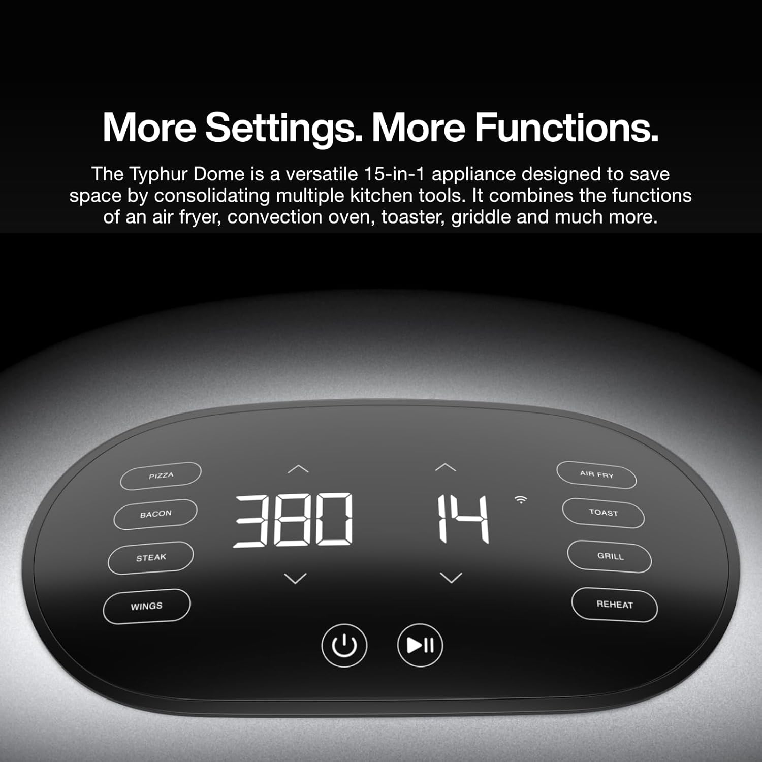 - 𝟭𝟱-𝗶𝗻-𝟭 𝗠𝘂𝗹𝘁𝗶𝗳𝘂𝗻𝗰𝘁𝗶𝗼𝗻𝗮𝗹 𝗖𝗼𝗼𝗸𝗶𝗻𝗴 | The Typhur Dome 2 is designed to save space by consolidating multiple kitchen tools in to one. It’s capable of 15 cooking functions, including Pizza, Bacon, Steak, Wings, Fries, Frozen, Air Fry, Toast, Grill, Bake, Griddle, Roast, Broil, Dehydrate, and Reheat, covering nearly every cooking need.