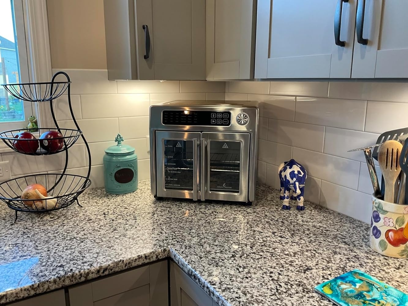 I was looking mainly for an air fryer but when I read how many different things I could do with this for just a little higher price than an air fried alone, I decided to give it a try. I also usually shy away from anything that is advertised on an infomercial but I found a YouTube video review that made me more comfortable with this brand since I could see it in use. I am so glad I chose this brand and model.Cooking: so far I have baked soft cookies for my pup and air fried fish nuggets for me. Both turned out amazing. The cookies were done in just over half the time of baking them in my oven. The fish was crispy on the outside but a little dry on the inside. Since this was my first time air frying I’m pretty happy with the results. Getting my timing right will just take a little practice.Appearance: I just love the style and how well it fits in my kitchen. I like lots of counter space so I was planning to just keep this in the pantry and pull it out when I wanted to use it. However, after unpacking the oven and trying it in a few places, I found the perfect fit was in the corner. When cooking I just pull it out a few inches to give space between the walls and cabinet bottoms for safety. Works and looks great.Overall Quality: The oven isn’t too heavy but does feel sturdy. The French doors open and close together, which I like, and the grill that comes with it is pretty heavy and seems well made. I’m pleased with the quality.Next I’m going to try the bread recipe that was included.
