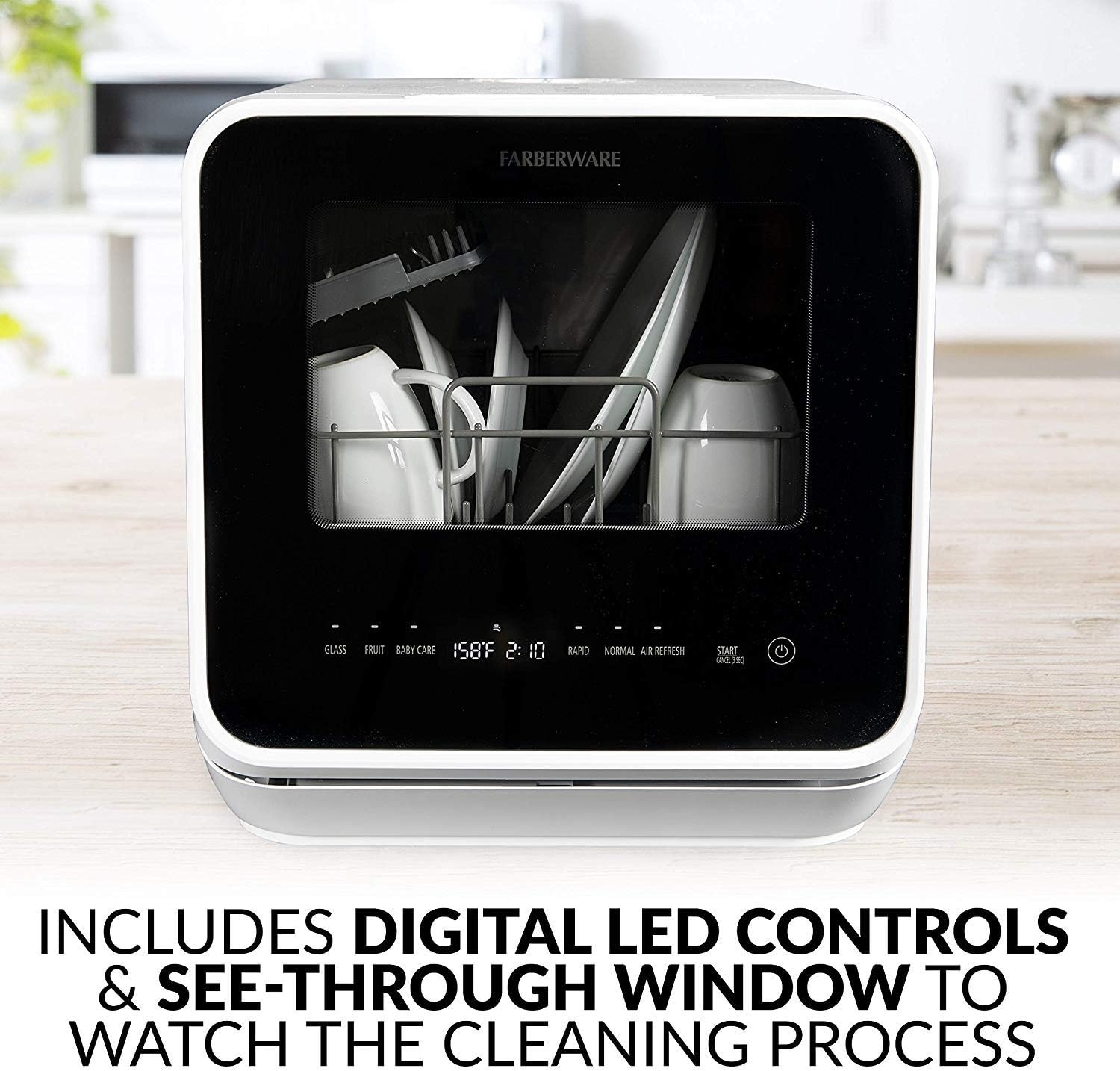- VERSATILE CLEANING: The Farberware countertop dishwasher offers five different wash cycles, including baby care, glass, and fruit wash, ensuring that all your dishes, from delicate glassware to baby bottles, are thoroughly cleaned and sanitized.