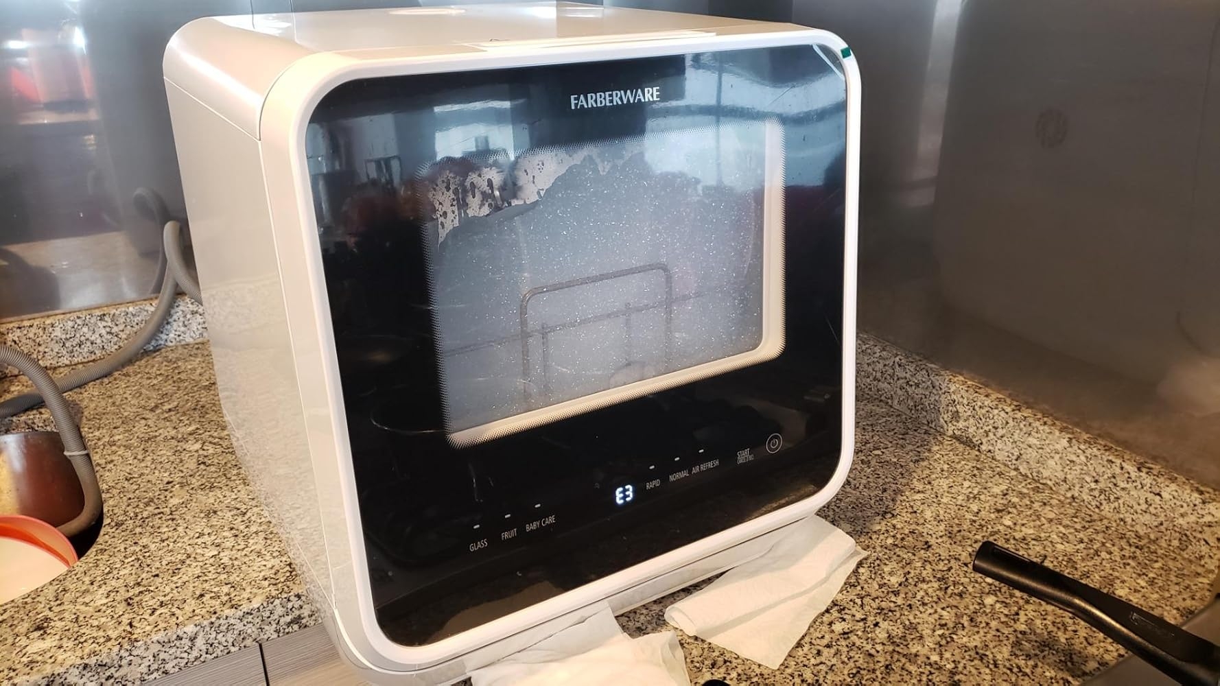 We bought a house in an area that the tap water is hard. The house does not have a water filtration system and the dishwasher that was here when we bought it did not work and was caked inside with deposits. We decided that replacing it was futile and as our kitchen in this home is fairly small we needed the storage space over a dishwasher.We still wanted the convenience of a dishwasher and a countertop model seemed like our best option. I have to admit that there are pluses and minuses to a unit such as this but I feel the pluses win out in the end. I had back surgery years ago and being bent over the sink washing dishes can get extremely uncomfortable even after a short time. This allows us to load dishes as we use them and then run when full. It is helping us keep up with the dishes and is saving my back the pain of handwashing. Granted, we still must manually wash the larger items that will not fit but it is still much faster to get through the chore with less pain for me.The machine can either be manually filled with water or hooked to the sink with an adapter. We went with the manual fill as the machine is right next to the sink and we just extend our sprayer to the fill point and turn on the water until it is full. It saves us from filling the included pitcher 3 times to wash a load. The machine beeps when full to let you know so you do not overfill it. Room temperature water can be used as the unit has a heater for the water built in. For those that will be hooking directly to the sink, please note the manual states to shut the water off after the load is completed.The drain hose is an ample length so if the machine is not right next to the sink it should still reach as long as you are not placing it too far away. Even at that, the drain hose can be placed into a bucket if the sink is too far. The biggest warning I can think of is that the clamp to hold the drain hose in place on the washer is a bit of a bear to get tightened due to how close it must be to the housing of the machine.We had bought another model before this one that was broken upon receipt. Unpacking the previous one was much more involved than this one. I say this only to note that unboxing and setup was very straight forward and quite simple with the exception of the aforementioned clamp for the drain hose. The manual does not show the precise way to connect the silverware tray and that was a bit of a puzzle for a moment but was easy enough to figure out.The machine is no noisier than a full size machine. I feel it is actually quieter than a full size. It has a good selection of cycles to choose from with the only thing I would like added is to be able to turn the heated dry off on the longer cycles.I would believe the most popular question people have is “How well does it clean dishes?” I have to say it does a really good job. I have purposely put dishes with dried on food in and had most come out sparkling clean. It does miss the odd spot however that is most likely due to me playing tetris to get more in and pretty much being guilty of overloading. I recommend more loads over fuller loads to keep you from rewashing or hand washing items again. In other reviews, people noted that the water from the top was more of a “trickle”. While it is not like the power sprayers in full size machines, it puts out a fair amount of water. It does not cover the entire area which I thought would lead to the upper items in the silverware tray to come out dirty. I was pleasantly surprised at how well it did clean.The only real issue we have had so far is that the second load of dishes came out with a film on them. We are unsure if this was due to the detergent we used, if we used too much or if there was residue from the test run the manufacturer does on the machines. We have not had a repeat of that since that load of dishes. That does remind me that the inside of the machine may be damp. It does warn you of this in the quick start guide and manual.The door is held shut magnetically and does not lock to my knowledge. It holds very tightly and I do not feel it will ever pop open during a load. I actually prefer this as the first machine that we returned was due to the PLASTIC door latch was broken upon receipt. There is no latch on this one to break which in my opinion is a plus.We like the different cycles for the machine and will be using the fruit cycle often. The size is also right for us as well. We have just a hair over 18″ under our cabinets. This machine fits nicely under them with about an inch to spare. The previous machine had incorrect measurements listed and would not fit under our cabinets. I must warn that the machine will not take a dinner plate over 10″ unless laid at an angle.To summarize, we really like the machine as it lessens our daily chore load. It is not an all inclusive solution but augments very well when properly used. It is saving me from an aching back and since it sits on the countertop, loading does not require bending down as a full sized machine requires.If you are in the market for such a machine, I feel this one should be on your final list of choices due to size, features, good performance, ease of use and versatility in placement. -
