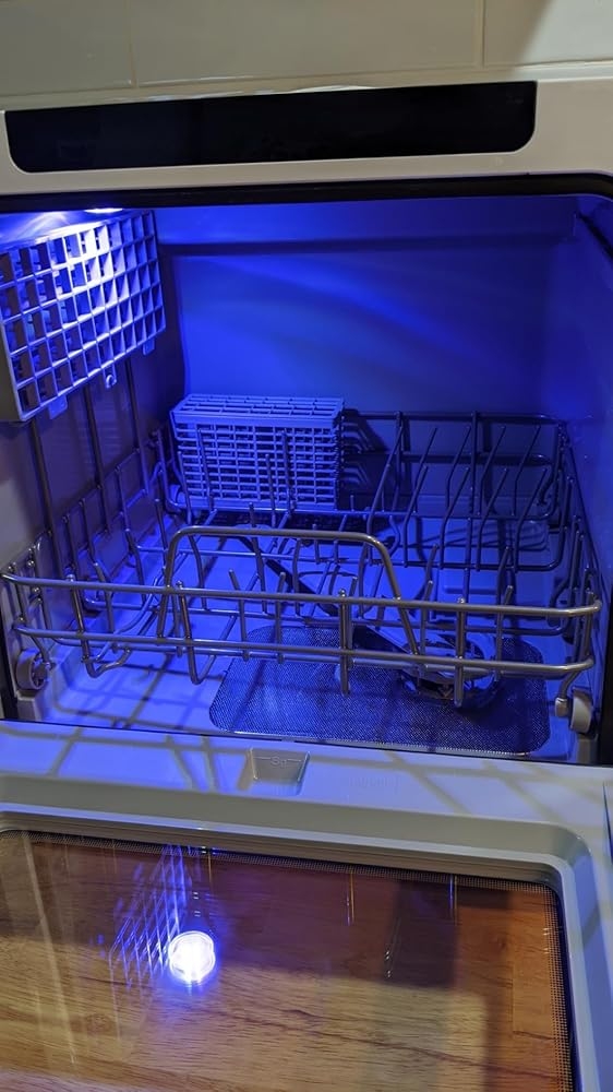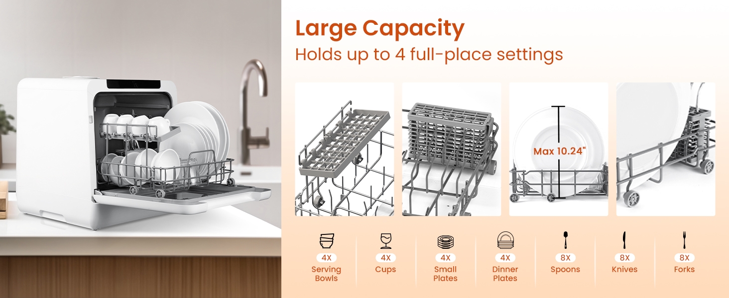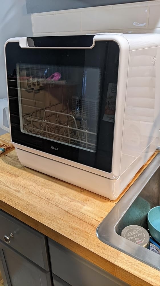- LARGE CAPACITY & SAVES ENERGY: HAVA Counter Top Dishwasher can hold up to 4 full-place settings and fit up to 11″ dishes loaded at an angle. This dishwasher only consumes 5 L of water per wash cycle, only 1/5 of the amount used by handwashing. Operating at 950 W, this appliance is a great energy-saving choice for every family.