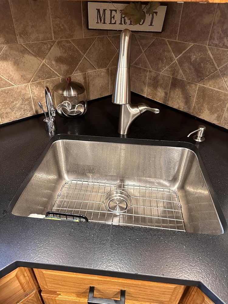After 26 years living in our home and having formica countertops with a standard two bowl sink, we decided it was time to upgrade our kitchen. We looked at a few options to go along with our quartz countertops. After selecting a different sink at first, when it arrived we decided we didn’t like it very much. I considered the square basin sinks with the square corners as it seem to be the modern trend, but after thinking about it for a period of time we decided to go with this awesome round corner, one basin Kraus sink. After having it now for 5 months we love it. The size is great, the looks are fantastic, the water drains very very nicely, and the sink had a finish in the design, a textured swirled in the bottom adding to the brushed looks. It cleans very nicely and no signs of any kind of rust whatsoever, as some people would indicated with other versions of sinks. This was the right choice for our kitchen design. The included bottom drying rack keeps the bottom from getting scratches, while the drain strainer hides the gunk, as you wash down the sides. I’d recommend a nice sink with a sprayer on it as it helps a lot to reach all the corners.
