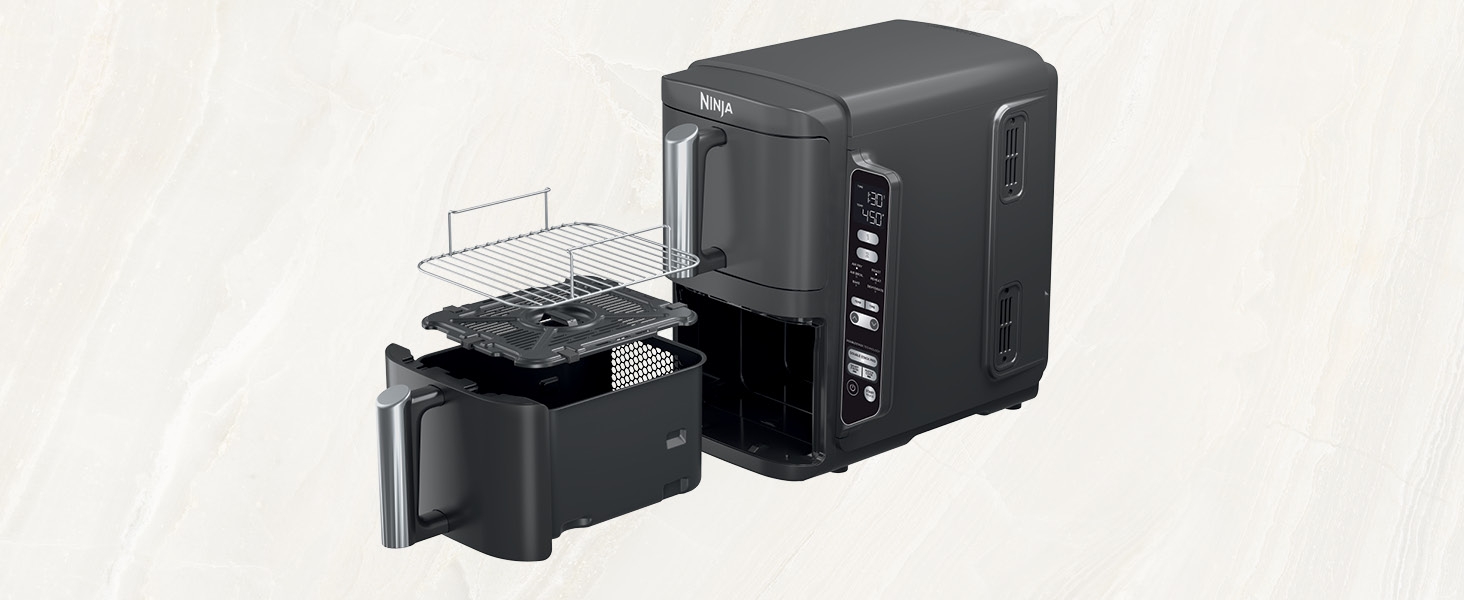 - DOUBLESTACK AIR FRYING TECHNOLOGY: Only Ninja’s stacked design has 2 independently controlled baskets so you can cook 4 foods at once.