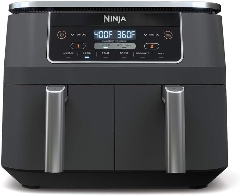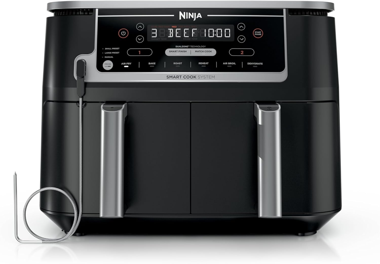 - WHAT’S INCLUDED: Ninja Foodi Dual Zone Air Fryer, Foodi Smart Thermometer, (2) 5 Quart Baskets, (2) Nonstick Crisper Plates & 15-Recipe Guide.