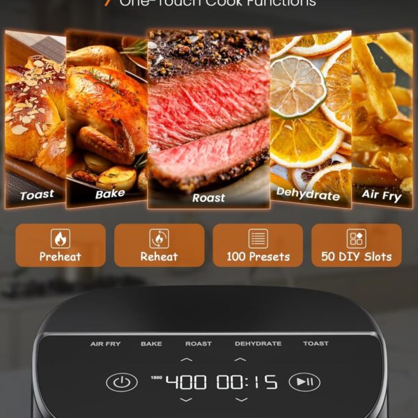 • 8-in-1 FUNCTIONALITY: Air fry, Roast, Broil, Bake, Pizza, Toast, Bagel, Dehydrate.