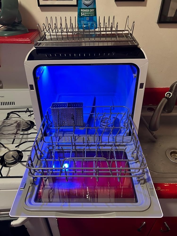 I have a tiny NYC tenement kitchen. I’ve upgraded the fridge and oven to the extent that space allowed, but I hated not having a dishwasher. Now that I this have one, and it has truly changed my life.It has multiple settings, but I generally use the Quick Wash, 29 minutes plus a one hour heated dry cycle. It has a small detergent well that uses only a little more than a tablespoon of Cascade liquid per wash.There is a sliding drawer on the top for silverware — you can see the tracks for it in the photo. My 10″ plates (which is the standard size) wouldn’t fit beneath the rack, so I removed it, and took the silverware container from my metal dish strainer and put it in the bottom rack (see photo) of the dishwasher and secured it with a twist tie. (It was stable without, but if all the knives, which are heavy, were on one side it would tilt.). I recommend removing the top rack, and puttingt in the silverware holder from a cheap Rubbermade /Dollor Store dish strainer, and just tossing the straining rack.I didn’t connect it to my faucet, because my faucet has a detachable spray/stream head. I can hook it to the top opening and let it fill. I just wait for the beeping that says it’s full (about 70 seconds), and I’m done. (I also refill it after every load, so it’s always ready to go.)At first my glassware was spotty and needed to be wiped. Then I realized on Quick Wash it pauses at 18 minutes (that sound is my cue to go into the kitchen, though it’s so quiet I have Alexa set a 12 minute timer at the start of the cycle), and at 17 minutes, it drains.I then pause the cycle, and put just 3 drops of Cascade Rinse Aid onto the bottom of the washer — spotting problem solved! It washes again until the 14 minus mark, when it empties again, and refills from the well for the final hot water cycle. It then does a heated dry cycle, but if I’m in a hurry to do another load, I put the wet dishes in the old stainless steel rack, which lives permanently atop the unit. The hose drains into my sink — I cut the drain hose cuz it was way longer than I needed it to be, and can either use the suction cup to anchor it to the sink, or let it float free, as in the photo.(And another benefit of the hot water draining 3 times, is when I have a large skillet or pot, I put it beneath the drain hose, so the dirty pot/pan is flooded with hot water — hot SOAPY water after the first cycle — and hence that much easier to clean.It fits the dishes, glassware and utensils from dinner for two with space to spare. It’s so fast I do a load of the dishes I used while preparing the meal (spatulas/utensils, mixing bowls, small cutting board, etc…) and they’re clean long before I clear the dinner plates and glasses, which become the second load. And its pretty quiet — can’t hear it in the LR of a SMALL apartment with the tv on, and I have a tv in the kitchen, which is perfectly audible above the sound of the wash cycle when I’m cooking.Do make sure to scrape all food off the plates — it has e a filter that catches anything left on plates, but a quick scrape/rinse saves having to clean the trap (which is easily done).I’ve had it for over a year, and I LOVE IT!!!