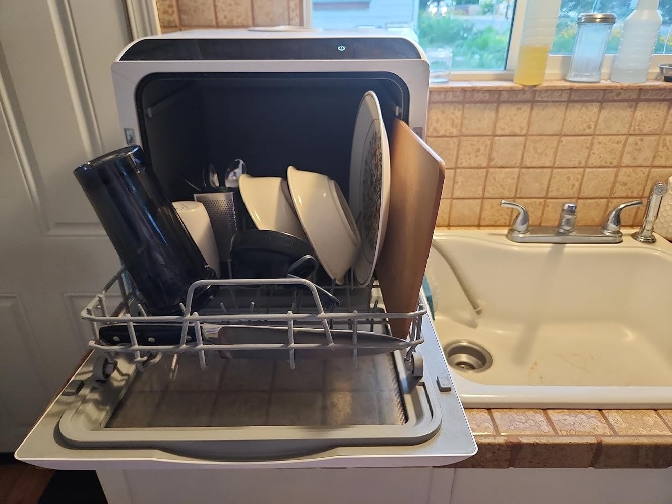 I live in a small rental, I hate doing dishes and quickly fall into a vicious cycle where I don’t clean then my dirty house makes me depressed then I’m depressed so I don’t clean. This dishwasher was literally life changing. I have had it for two years now and had zero issues.There are a couple things I have learned about the dishwasher that could be seen as cons but in no way outweigh just how wonderful this little machine is.The drying cycle makes a high pitched noise that I do not love. Glass comes out streaky when I use the drying anyways so I just turn the dishwasher off, open the door, and pull out the rack to air dry.Pods contain too much soap for such a small machine and leave residue, I use a generic powder detergent and fill the cup in the door.I initially hooked it up directly to my faucet which was nice in some ways but I found that it lost its “set it and forget it” ability. You have to leave your tap on during the cycle then turn it off after. I like to start my dishwasher and go to bed so I ended up going back to the top fill option.The filling pitcher doesn’t work well for me, maybe if you are taller or your dishwasher is placed lower it would work for you but I end up missing the target and pouring water everywhere. My sink sprayer hose reaches just right to the top, I drape a tea towel over the top of my hand/the dishwasher to contain the spray back when I fill it. Works perfectly.I think the upper cutlery rack blocks the jets from above and hinders cleaning. I got rid of my upper rack and got a utensil cup from Amazon, with the rack gone I can fit full size dinner plates and my small cutting board.I always fill with hot water and I always use the quick setting. This machine is plenty powerful and gets things very clean. Sometimes I get lazy with cleaning the filter and have a load come out with food still on it. Quick rinse of the filter, run it again and dishes come out clean.The picture shows a very light load, I generally cram a lot more dishes in there. I purposefully bought pots and pans that fit in this dishwasher(again removing the cutlery rack makes space for much larger items).This dishwasher was very helpful when I was providing full time care to my newborn niece as well. I used the fruit basket for nipples, bottle collars, and other little parts that some bottles have. Everything comes out absolutely steaming. Far more sanitary than my hand washing abilities.I have used this machine 1 to 5 times a day every day for 2 years and would not want to live without it. Worth every penny and worth every bit of my limited counter space it takes up. -
