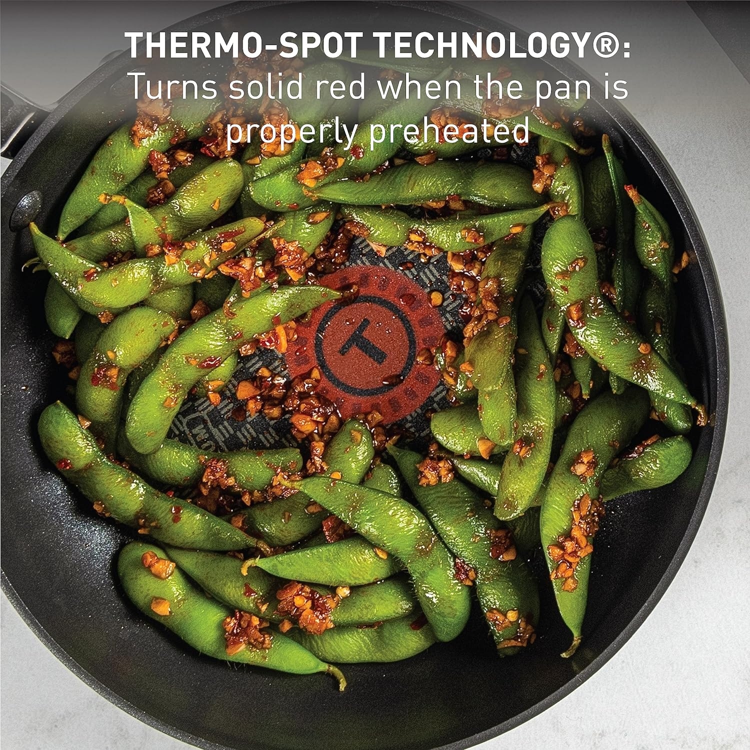 This kitchen pots and pans set from T-fal prepares weekday dinners, laid-back brunch, and holiday entertaining for life’s culinary adventures. With rugged hard-anodized aluminum construction, the collection retains steady heat and resists corrosion, scratching, and warping. The T-fal Heat Mastery System unites a durable non-stick coating, an even-heat base, and patented Thermo-Spot technology for reliably delicious results. That Thermo-Spot indicator turns solid red when the pan is properly preheated, promoting evenly cooked food that seals in natural juices and flavor.