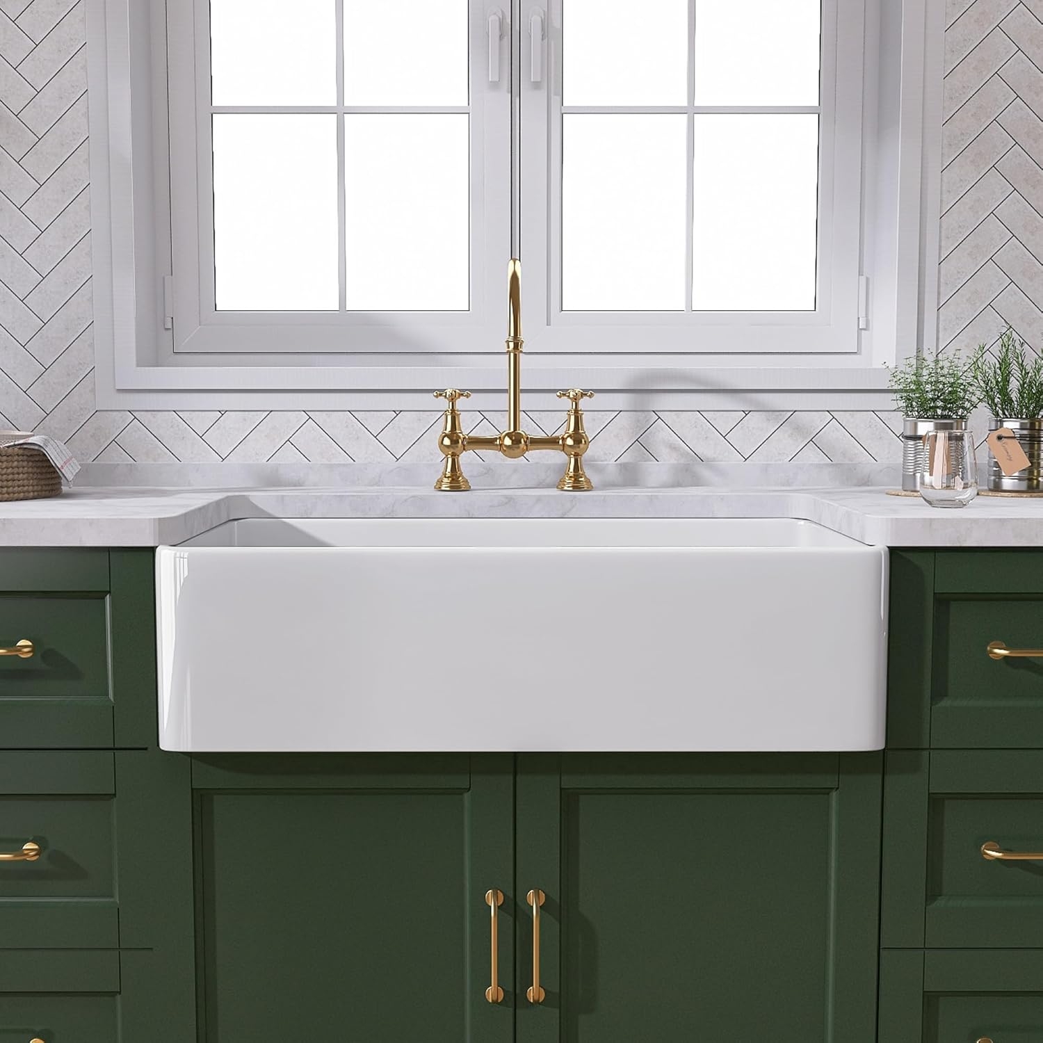 TUKTUK white farmhouse sink 30 inch made from Italian true FIRECLAY, a special clay that’s fired at a high temperature 2600 °F for strength and durability, makes this farm sink 30 inch solid core construction for heavy-duty use, sound absorbing, scratch resistant and the glaze will not change over years, always keep beauty and reliable performance. Elegant super glossy white makes this apron sink will be the centerpiece of any kitchen. This white kitchen sink built to last, can be durable for decades.