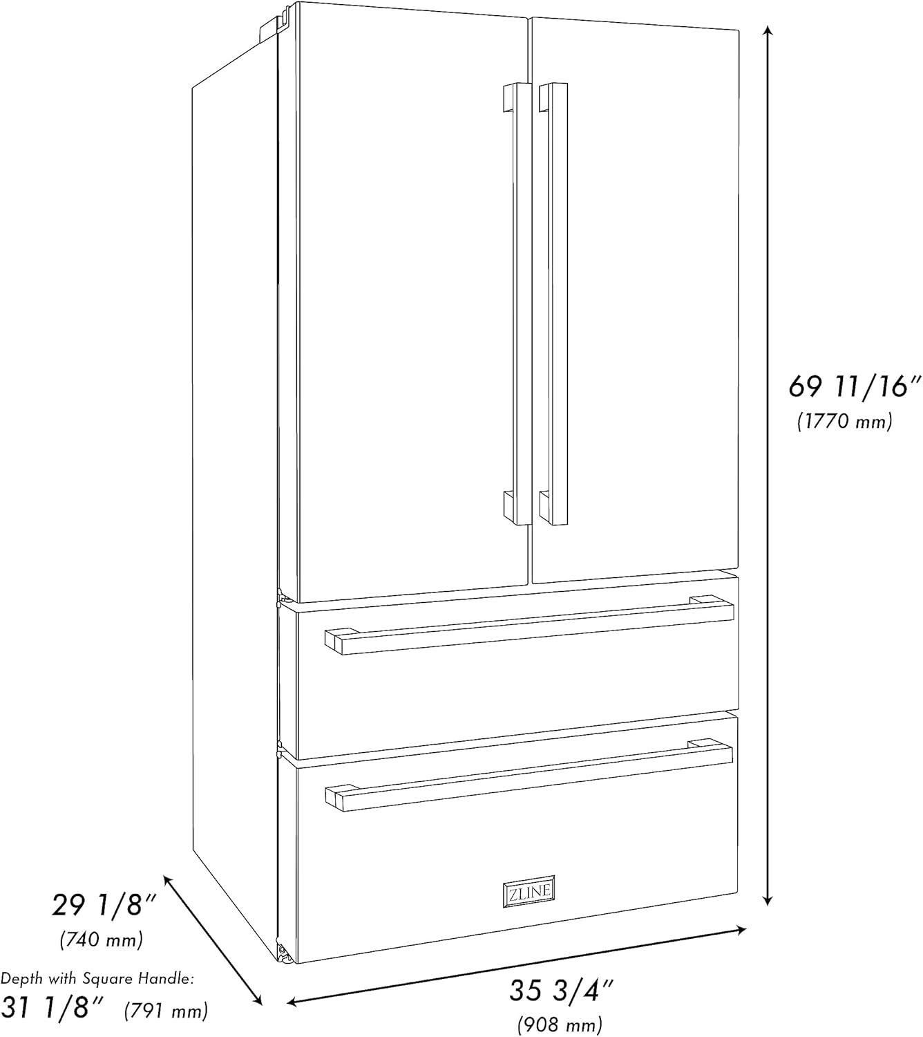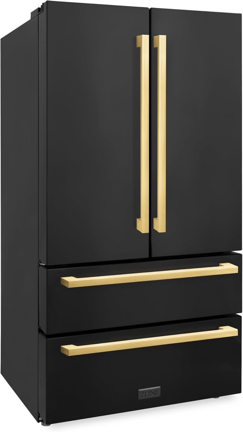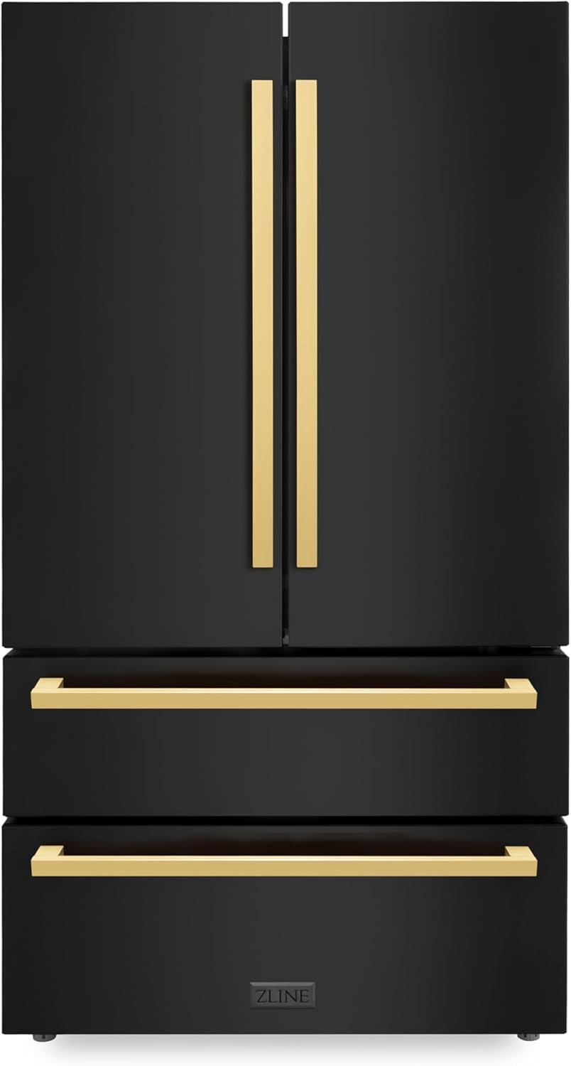 Model Name | ZLINE Autograph Edition 36 in. 22.5 cu. ft. Counter-Depth French Door Refrigerator with Ice Maker in Fingerprint-Resistant Black Stainless Steel and Polished Gold Modern Handles (RFMZ-36-BS-FG) |